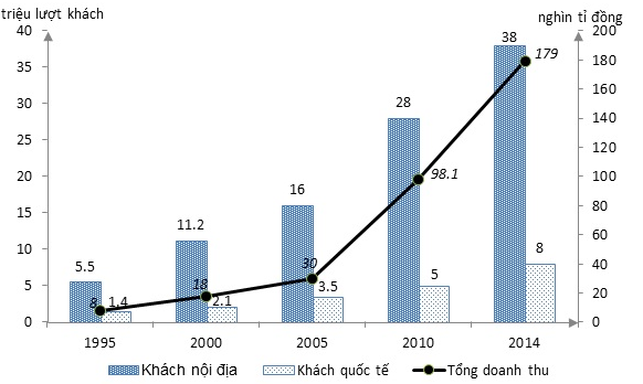 Cho biểu đồ về du lịch nước ta qua các năm (Nguồn: Niên giám thống kê Việt Nam 2015, NXB