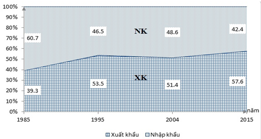 Căn cứ vào biểu đồ trên, cho biết nhật xét nào sau đây không đúng về hoạt động ngoại thương của Trung Quốc giai đoạn 1985 – 2015?