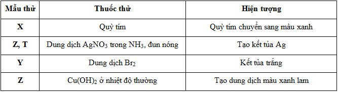 Tiến hành thí nghiệm với các dung dịch X, Y, Z, T. Kết quả được ghi ở bảng sau: