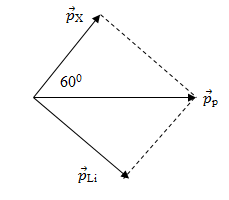 Người ta dùng hạt p bắn vào hạt nhân \({}_4^9Be\) đứng yên tạo ra hạt \({}_3^6Li\) và hạt nhân X. Biết động năng của các hạt p, X lần lượt là 5,45 MeV và 4 MeV, góc lập bởi hướng chuyển động của các hạt p và X là 60°, động năng của Li xấp xỉ là