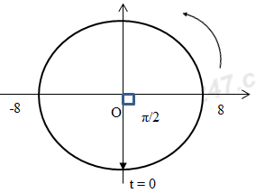 Một chất điểm chuyển động tròn đều trong mặt phẳng thẳng đứng, có bán kính quỹ đạo là 8 cm, bắt đầu từ vị trí thấp nhất của đường tròn theo chiều ngược chiều kim đồng hồ với tốc độ không đổi là 16π cm/s. Hình chiếu của chất điểm lên trục Ox nằm ngang, đi qua tâm O của đường tròn, nằm trong mặt phẳng quỹ đạo, có chiều từ trái qua phải là
