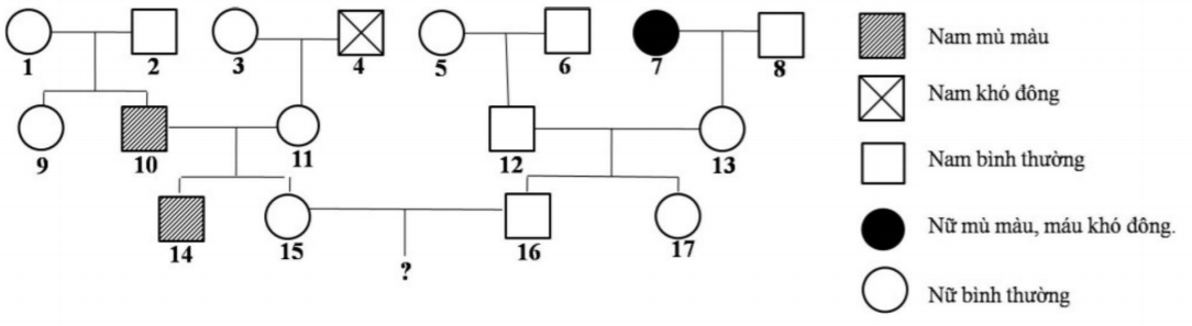 Cho sơ đồ phả hệ sau đây về bệnh mù màu và máu khó không. Biết rằng bệnh mù màu do gen