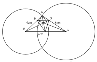 Vẽ \(\Delta ABC\) có \(AB=4cm,\ AC=5cm,\ BC=7cm.\) Lấy điểm I nằm trong \(\Delta ABC\), cắt BC tại F, CI cắt AB tại H, BI cắt AC tại G. Vẽ \(\Delta FHG.\)