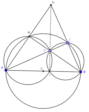 3. Gọi I là giao điểm thứ hai của đường tròn ngoại tiếp tam giác ADM và tam giác BDC. Chứng minh ba điểm N, D, I thẳng hàng.