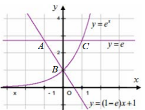 Cho (H) là hình phẳng giới hạn bởi các đồ thị hàm số \(y=e,\,\,y={{e}^{x}}\) và \(y=(1-e)x+1\) (tham khảo hình vẽ bên). Diện tích của (H) là