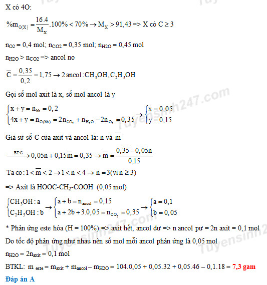 Axit cacboxylic X hai chức (có % khối lượng O nhỏ hơn 70%), Y và Z là 2 ancol đồng đẳng kế tiếp