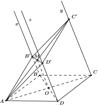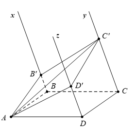 Trong mặt phẳng \(\left( P \right),\) cho hình bình hành \(ABCD.\) Vẽ các tia \(Bx,\,\,Cy,\,\,Dz\) song song với nhau, nằm cùng phía với mặt phẳng \(\left( ABCD \right),\) đồng thời không nằm trong mặt phẳng \(\left( ABCD \right).\) Một mặt phẳng đi qua \(A,\) cắt \(Bx,\,\,Cy,\,\,Dz\) tương ứng tại \({B}',\,\,{C}',\,\,{D}'.\) Biết \(B{B}'=2,\,\,D{D}'=4.\) Tính \(C{C}'.\)
