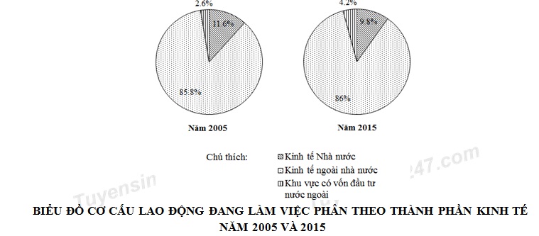 Căn cứ vào biểu đồ, cho biết nhận xét nào sau đây đúng với cơ cấu lao động đang làm việc phân theo thành phần kinh tế nước ta năm 2015 so với năm 2005?