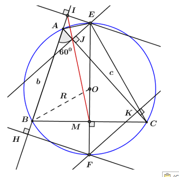 Cho tam giác ABC có \(\widehat{BAC}={{60}^{0}};AC=b,AB=c\ \ (b>c).\) Đường kính EF của đường tròn ngoại tiếp tam giác ABC vuông góc với BC tại M (E thuộc cung lớn BC). Gọi I và J là chân đường vuông góc hạ từ E xuống các đường thẳng AB và AC. Gọi H, K là chân đường vuông góc hạ từ F xuống các đường AB và AC.
