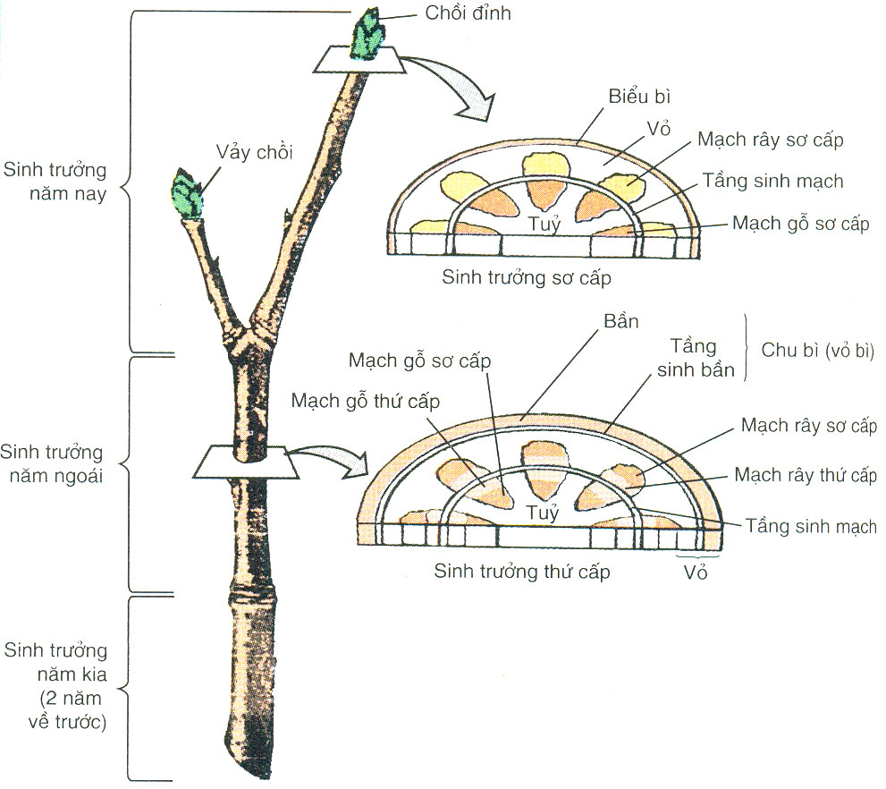 Giải phẫu mặt cắt ngang thân sinh trưởng sơ cấp theo thứ tự từ ngoài vào trong thân là: