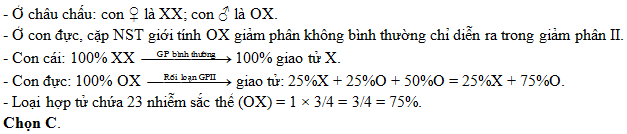 Nếu trong quá trình giảm phân ở tất cả các tế bào sinh trứng của châu chấu cái (2n=24) đều hoàn toàn bình thường, còn ở tất cả các tế bào sinh tinh của châu chấu đực đều không có sự phân li của nhiễm sắc thể giới tính thì tính theo lí thuyết, khi 2 con châu chấu này giao phối với nhau sẽ tạo ra loại hợp tử chứa 23 nhiễm sắc thể với tỉ lệ là: