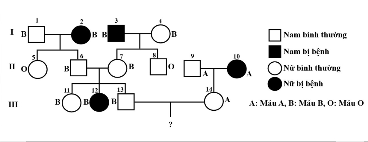 Cho sơ đồ phả hệ mô tả sự di truyền nhóm máu hệ ABO và một bệnh M ở người do 2 locut thuộc 2 cặp NST khác nhau qui định. Biết rằng, bệnh M trong phả hệ là do một trong 2 alen có quan hệ trội lặn hoàn toàn của một gen quy định; gen quy định nhóm máu gồm 3 alen IA, IB, IO; trong đó alen IA quy định nhóm máu A, alen IB quy định nhóm máu B đều trội hoàn toàn so với alen IO quy định nhóm máu O và quần thể này đang ở trạng thái cân bằng di truyền về tính trạng nhóm máu với 4% số người có nhóm máu O và 21% số người có nhóm máu B.