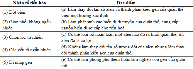 Cho bảng sau đây về các nhân tố tiến hóa và các thông tin tương ứng: Tổ hợp ghép đúng