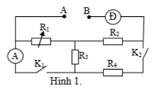 Cho mạch điện như hình 1. R1 là một biến trở, R2 = 8Ω;R3 = R4 = 12Ω. Đèn Đ(12V – 12W), ampe kế lí tưởng. Cho hiệu điện thế UAB = 24V.