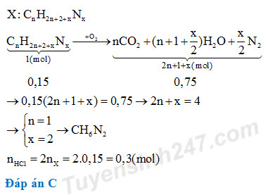 Viết PTHH của phản ứng cháy. Từ số mol amin X và tổng số mol Y biện luận tìm được n, x.