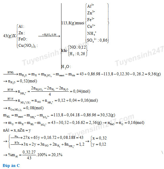 Hòa tan hoàn toàn 43,0 gam hỗn hợp X gồm Al, Zn, FeO, Cu(NO3)2 cần dùng hết 860 ml dung dịch H2SO4 1M thu được hỗn hợp khí Y (đktc) gồm 0,12 mol NO và 0,26 mol H2, đồng thời thu được dung dịch Z chỉ chứa các muối sunfat trung hòa. Cô cạn dung dịch Z thu được 113,8 gam muối khan. Thành phần phần trăm khối lượng của Al trong hỗn hợp X có giá trị gần nhất là