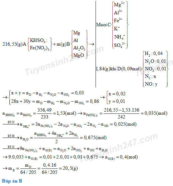 Người ta hòa 216,55 gam hỗn hợp muối KHSO4 và Fe(NO3)3 vào nước dư thu được dung dịch A. Sau đó cho m gam hỗn hợp B gồm Mg, Al, Al2O3 và MgO vào dung dịch A rồi khuấy đều tới khi các phản ứng xảy ra hoàn toàn thấy B tan hết, thu được dung dịch C chỉ chứa các muối và có 2,016 lít hỗn hợp khí D có tổng khối lượng là 1,84 gam gồm 5 khí (đktc) thoát ra trong đó về thể tích H2, N2O, NO2 lần lượt chiếm 4/9, 1/9 và 1/9. Cho BaCl2 dư vào C thấy xuất hiện kết 356,49 gam kết tủa trắng. Biết trong B oxi chiếm 64/205 về khối lượng. Giá trị của m gần nhất với giá trị nào sau đây?