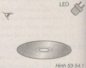 Hãy làm thí nghiệm sau để có thể trả lời câu hỏi của bài. Chiếu ánh sáng phát ra từ một đèn LED lục vào mặt ghi của một đĩa CD rồi quan sát ánh sáng phản xạ từ mặt đĩa theo đủ mọi phía (hình 53-54.1). Ta sẽ thấy những ánh sáng màu gì?