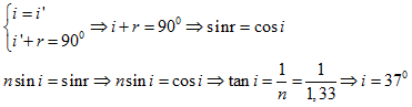 Một tia sáng truyền từ nước và khúc xạ ra không khí với góc tới i. Tia khúc xạ và tia phản xạ tại mặt nước vuông góc với nhau. Nước có chiết suất là 1,33. Góc tới i có giá trị