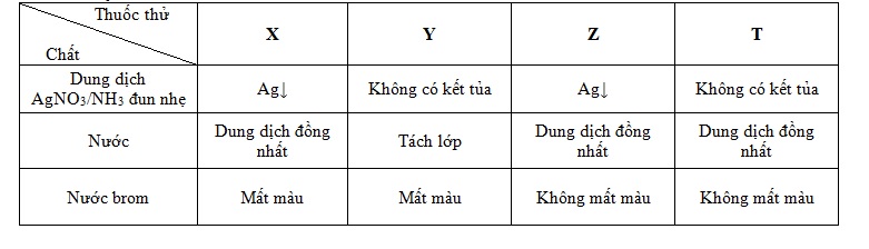 Tiến hành thí nghiệm với các chất X, Y, Z, T. Kết quả được trình bày tring bảng dưới