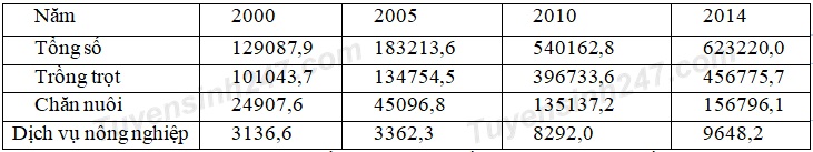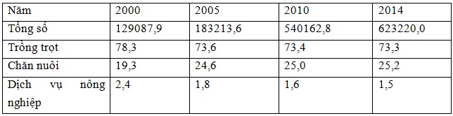 Cho bảng số liệu sau: GIÁ TRỊ SẢN XUẤT NÔNG NGHIỆP CỦA NƯỚC TA PHÂN THEO NGÀNH (Đơn vị: Tỉ
