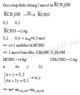 Hỗn hợp X gồm hai ancol no, đơn chức, mạch hở, kế tiếp nhau trong dãy đồng đẳng. Oxi hóa hoàn toàn 0,2 mol hỗn hợp X có khối lượng m gam bằng CuO đun nóng thu được hỗn hợp sản phẩm hữu cơ Y. Cho Y tác dụng với một lượng dư dung dịch AgNO3 trong NH3, thu được 54 gam Ag. Giá trị của m là