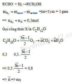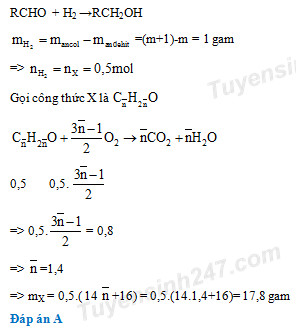 Hiđro hóa hoàn toàn m gam hỗn hợp X gồm hai anđehit no, đơn chức, mạch hở, kế tiếp nhau trong dãy đồng đẳng thu được (m + 1) gam hỗn hợp hai ancol. Mặt khác, khi đốt cháy hoàn toàn cũng m gam X thì cần vừa đủ 17,92 lít khí O2 (ở đktc). Giá trị của m là