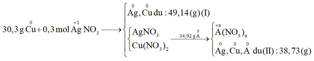 Cho 30,3 gam Cu vào 300 ml dung dịch AgNO3 1M một thời gian thu được 49,14 gam chất rắn X và dung dịch Y. Nhúng thanh kim loại A nặng 34,92 gam vào dung dịch Y khuấy đều đến khi phản ứng hoàn toàn thu được dung dịch chỉ chứa một muối duy nhất và 38,73 gam chất rắn Z. Kim loại A là