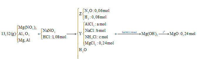 Hòa tan hết 13,52 gam hỗn hợp X gồm Mg(NO3)2, Al2O3, Mg và Al vào dung dịch chứa hai chất tan NaNO3 và 1,08 mol HCl. Sau khi kết thúc phản ứng, thu được dung dịch Y chỉ chứa các muối và 3,136 lít (đktc) hỗn hợp khí Z gồm N2O và H2, có tỉ khối so với He bằng 5. Dung dịch Y tác dụng tối đa với dung dịch chứa 1,14 mol NaOH, lấy kết tủa nung ngoài không khí tới khối lượng không đổi thu được 9,6 gam chất rắn. Khối lượng của Al có trong hỗn hợp X là