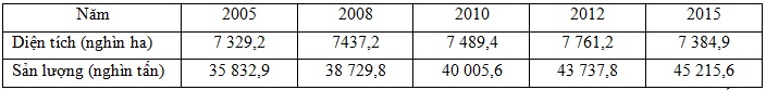 Nhận xét nào sau đây đúng với diện tích và sản lượng lúa của nước ta giai đoạn 2005 - 2015 theo bảng số liệu trên?