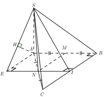 Chóp S.ABC, \(SA\bot \left( ABC \right),\,\,\Delta ABC\) vuông cân tại B, \(AB=2a,\,\,SA=2a\sqrt{3}\). M là trung điểm của AB. (P) qua SM và song song với BC, cắt AC tại N. Tính \(d\left( SN;AB \right)\) ?