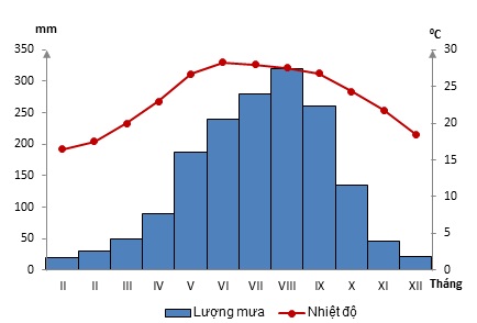 Cho biểu đồ sau: NHIỆT ĐỘ LƯỢNG MƯA TRUNG BÌNH THÁNG Ở HÀ NỘI Căn cứ vào biểu đồ, cho