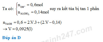 Cho 600 ml dung dịch NaOH 1M vào V ml dung dịch AlCl3 2M thì thu được 10,92 gam kết tủa. Giá trị của V là: