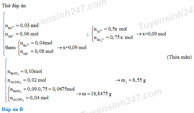 Cho 300 ml dung dịch Ba(OH)2 0,1M vào 250 ml dung dịch Al2(SO4)3 xM thu được dung A và 8,55 gam kết tủa. Thêm tiếp 600 ml dung dịch Ba(OH)2 0,1M vào A thì thu được lượng kết tủa là 10,485 gam. Giá trị của x là