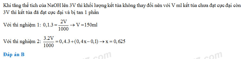 Khi tăng thể tích của NaOH lên 3V thì khối lượng kết tủa không thay đổi nên với V ml kết tủa chưa đạt cực đại còn 3V thì kết tủa đã đạt cực đại và bị tan 1 phần