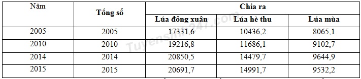 Cho bảng số liệu: SẢN LƯỢNG LÚA CẢ NĂM CỦA NƯỚC TA, GIAI ĐOẠN 2005 – 2015 (Đơn vị: nghìn
