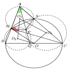 c) Gọi \({O_1};{O_2};{O_3}\) lần lượt là tâm đường tròn ngoại tiếp ba tam giác AMN, BMP và CNP. Chứng minh rằng 4 điểm \(O;{O_1};{O_2};{O_3}\) cùng thuộc một đường tròn.