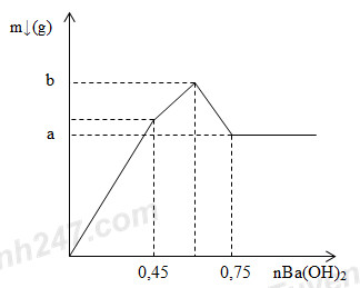 Nhỏ từ từ dung dịch Ba(OH)2 vào dung dịch hỗn hợp Al2(SO4)3 và AlCl3 thu được kết tủa có khối lượng theo số mol Ba(OH)2 như đồ thị: