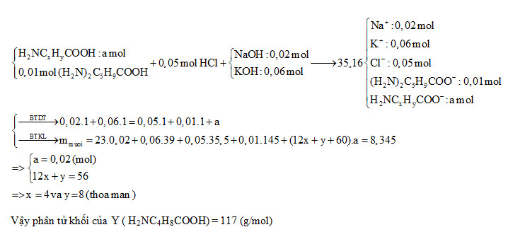Cho hỗn hợp X gồm amino axit Y (H2NCxHyCOOH) và 0,01 mol (H2N)2C5H9COOH tác dụng với 50 ml dung dịch HCl 1M, thu được dung dịch Z. Dung dịch Z tác dụng vừa đủ với dung dịch chứa 0,02 mol NaOH và 0,06 mol KOH, thu được dung dịch chứa 8,345 gam muối. Phân tử khối của Y là