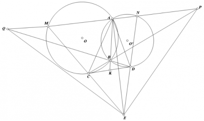 Cho hai đường tròn (O) và (O’) cắt nhau tại 2 điểm A, B (O và O’ thuộc 2 nửa mặt phẳng bờ AB). Tiếp tuyến chung gần B của 2 đường tròn lần lượt tiếp xúc với (O), (O’) tại C, D. Qua A kẻ đường thẳng song song với CD lần lượt cắt (O), (O’) tại M, N (khác A). Các đường thẳng CM và DN cắt nhau tại E. Gọi P, Q là giao điểm của MN với BC và BD. Chứng minh rằng: