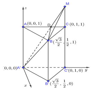 Cho lăng trụ tam giác đều \(ABC.{A}'{B}'{C}'\) có tất cả các cạnh bằng \(a\).\(M\) là một điểm thỏa mãn \(\overrightarrow{CM}=-\frac{1}{2}\overrightarrow{A{A}'}\). Cô sin của góc giữa hai mặt phẳng \(\left( {A}'MB \right)\) và \(\left( ABC \right)\) bằng