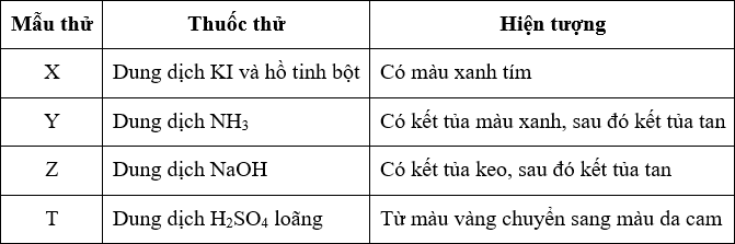 Kết quả thí nghiệm của các dung dịch X, Y, Z, T với thuốc thử được ghi ở bảng sau: