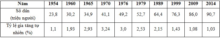 Bảng số liệu về số dân và tỷ lệ gia tăng tự nhiên của nước ta 1954 – 2014