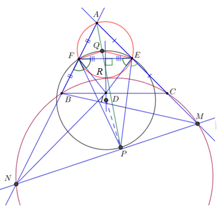 Cho tam giác ABC nhọn AB < AC. Gọi E, F lần lượt là trung điểm của CA, AB. Trung trực của đoạn EF cắt BC tại D. Giả sử P nằm trong \(\widehat{EAF}\) và nằm ngoài tam giác AEF sao cho \(\widehat{PEC}=\widehat{DEF};\ \widehat{\ PFB}=\widehat{DFE}\). PA cắt đường tròn ngoại tiếp tam giác PEF tại Q khác P.
