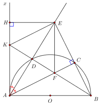 Cho điểm C thuộc nửa đường tròn đường kính AB. Kẻ tiếp tuyến Ax với nửa đường tròn đó (Ax nằm trên cùng nửa mặt phẳng có bờ là đường thẳng AB chứa nửa đường tròn). Tia phân giác của góc CAx cắt nửa đường tròn tại D. Kéo dài AD và BC cắt nhau tại E. Kẻ EH vuông góc với Ax tại H.