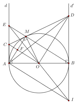Cho đường tròn (O; R), đường kính AB, M là một điểm tùy ý thuộc đường tròn (M khác A và B). Qua A và B lần lượt kẻ các đường thẳng d và d’ là tiếp tuyến với đường tròn. Tiếp tuyến tại M của đường tròn cắt d và d’ lần lượt tại C và D. Đường thẳng BM cắt d tại E.
