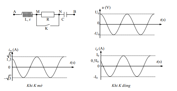 Đặt vào hai đầu đoạn mạch AB một điện áp xoay chiều có đồ thị điện áp tức thời phụ thuộc vào thời gian như hình vẽ. Trong đó điện áp cực đại U0 và chu kì dòng điện không thay đổi. Khi đóng và mở khóa K thì cường độ dòng điện tức thời trong mạch phụ thuộc vào thời gian như hình vẽ. Giá trị của I0 là