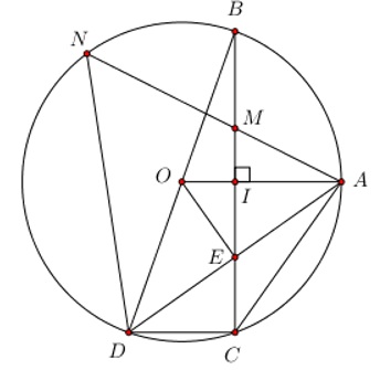 Cho đường tròn (O; OA). Trên bán kính OA lấy điểm I sao cho \(OI = \frac{1}{3}OA\). Vẽ dây BC vuông góc với OA tại điểm I và vẽ đường kính BD. Gọi E là giao điểm của AD và BC.