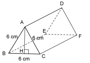 Cho hình lăng trụ đứng ABC.DEF, đáy là tam giác đều ABC có cạnh 6 cm, thể tích hình lăng trụ