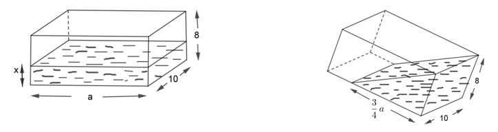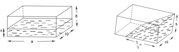 Một thùng nước hình hộp chữ nhật có chiều rộng 10 dm, chiều cao 8 dm, trong thùng đựng một phần nước khi nghiêng thùng cho nước trong thùng vừa vặn phủ kín mặt bên 10 dm x 8 dm thì nước còn phủ 3 phần 4 đáy thùng. Tính chiều cao của mực nước?